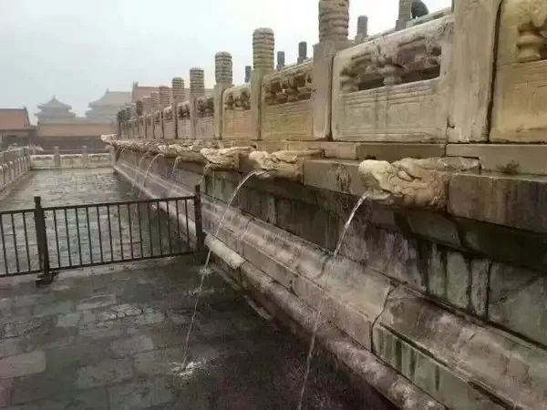 前三殿的“千龙出水”是紫禁城排水系统中最精彩的部分。故宫设计之初,为了防止积水,在太和殿、中和殿和保和殿三层台基的四周栏杆底部,设计了1142个排水龙头,龙头也被称为“螭首”,雕琢精美,内为凿通的圆孔,是主要的排水口。